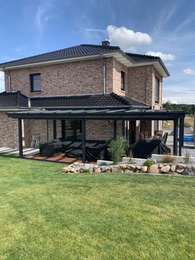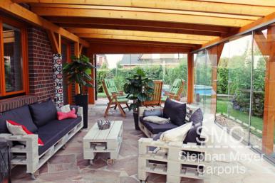 Wir lassen unsere Terrassenüberdachungen auf hochmodernen Abbundanlagen fertigen und verwenden hierzu ausschließlich Premium Brettschichtholz (BSH). Als Dacheindeckung empfehlen wir Stegplatten oder Verbundsicherheitsglas (VSG). Auf Wunsch planen wir gerne eine Ganzglasschiebeanlage hinzu, die ihre Überdachung zu einem Kaltwintergarten werden lässt.