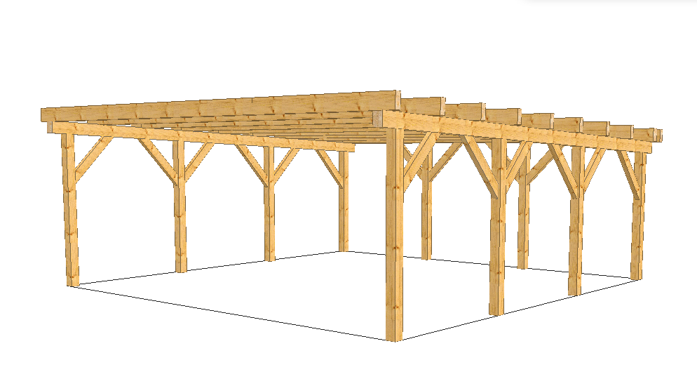 Unser Carportbausatz "Tellmer" in den Abmessungen aus Brettschichtholz (BSH 11) in 9,00m x 6,00m. Das Dach ist mit Trapezblechen eingedeckt (inkl. Vlies) und verfügt über eine Zinkdachentwässerung. Der Geräteraum hat die Maße 3,00m x 6,00m und ist mit einer Deckelschalung verkleidet. Die Ständerfüße (verdeckt geschraubt) sind in die Pfosten bereits vormontiert. Die Lieferung erfolgt bis Bordsteinkante. Der Bausatz umfasst die Holzkonstruktion, die Bleche, die Rinne, Pfostenträger, Fassadenbretter und notwendigen Schrauben. Die Holzpositionen sind unbehandelt.
