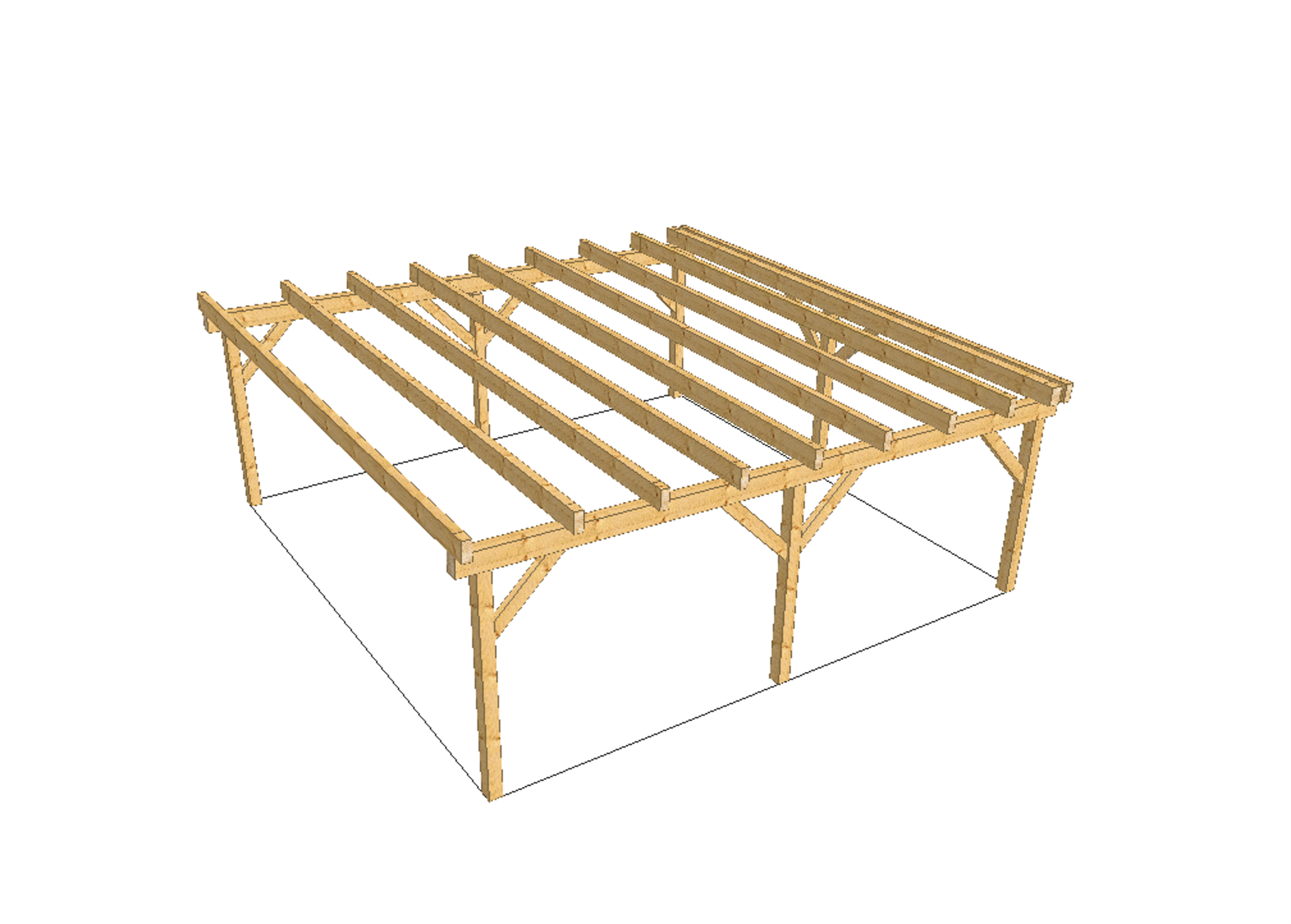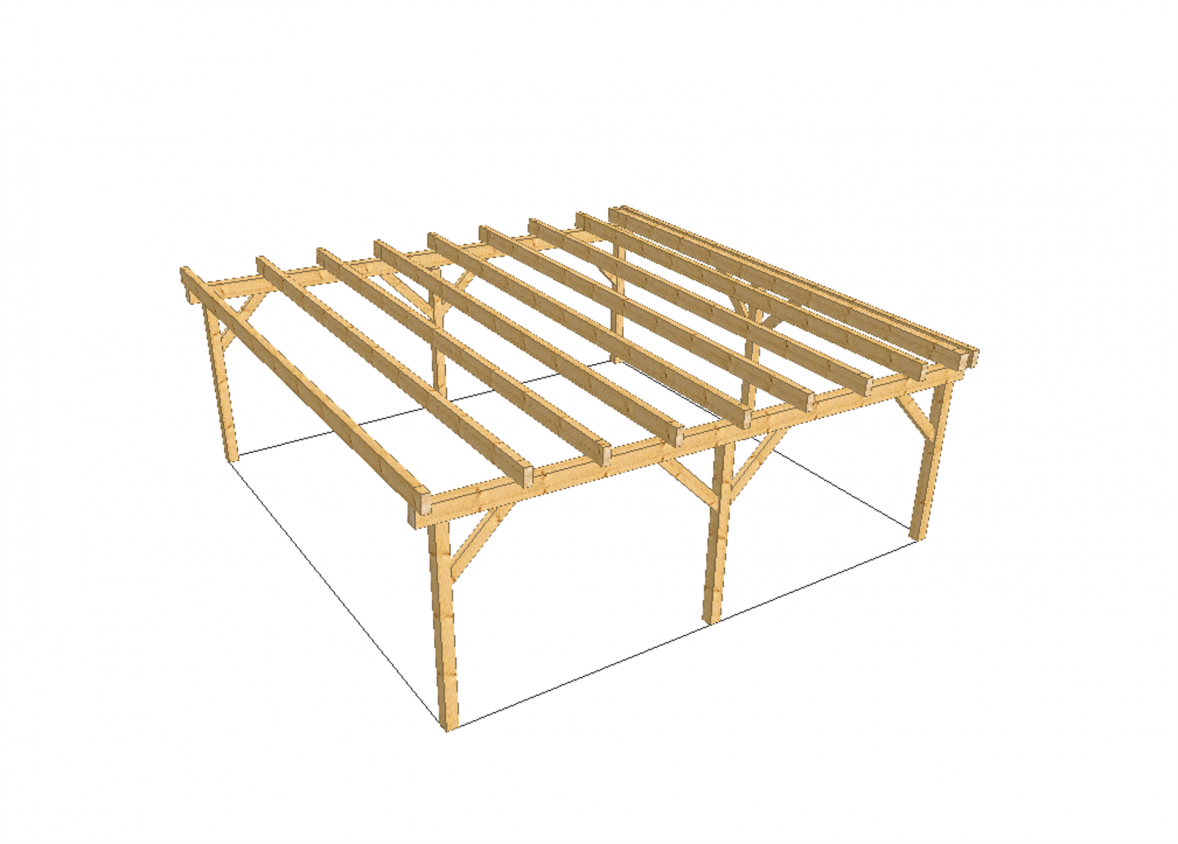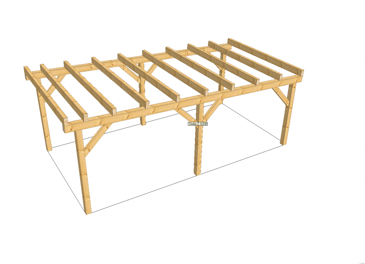 Unser Carportbausatz "Tellmer" in den Abmessungen aus Brettschichtholz (BSH 11) in 6,00m x 9,00m. Das Dach ist mit Trapezblechen eingedeckt (inkl. Vlies) und verfügt über eine Zinkdachentwässerung. Der Geräteraum hat die Maße 3,00m x 6,00m und ist mit einer Deckelschalung verkleidet. Die Ständerfüße (verdeckt geschraubt) sind in die Pfosten bereits vormontiert. Die Lieferung erfolgt bis Bordsteinkante. Der Bausatz umfasst die Holzkonstruktion, die Bleche, die Rinne, Pfostenträger, Fassadenbretter und notwendigen Schrauben. Die Holzpositionen sind unbehandelt.